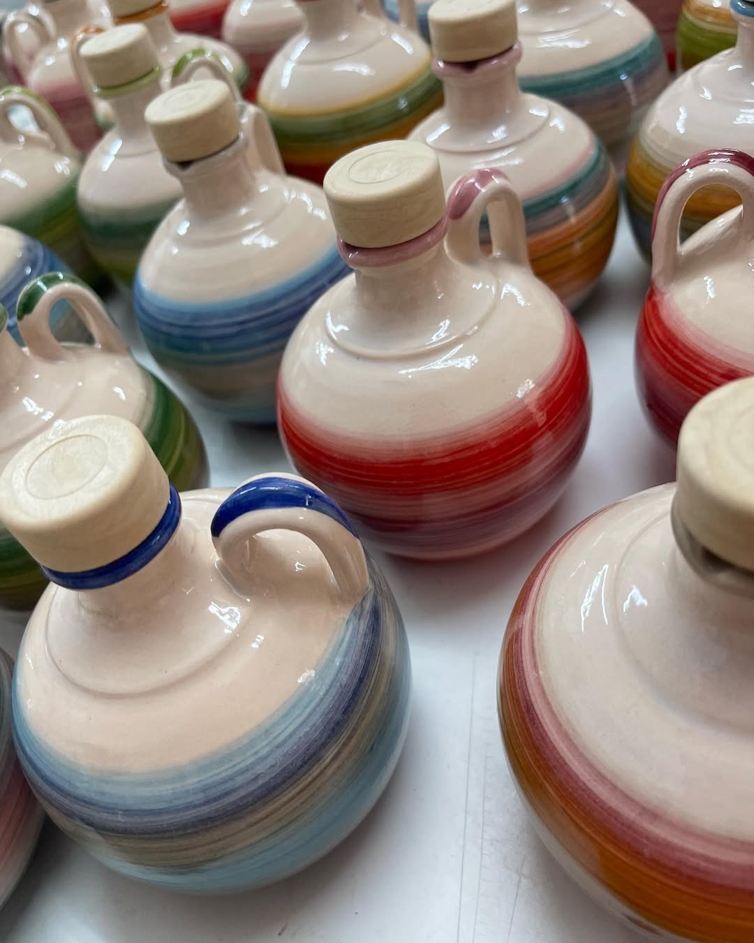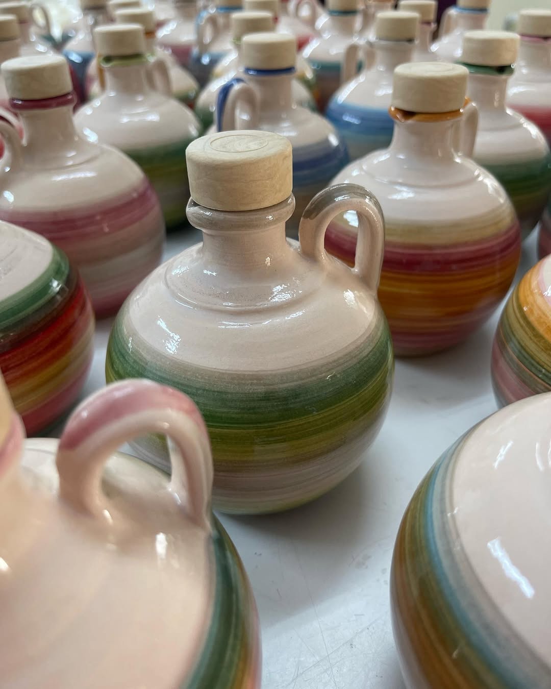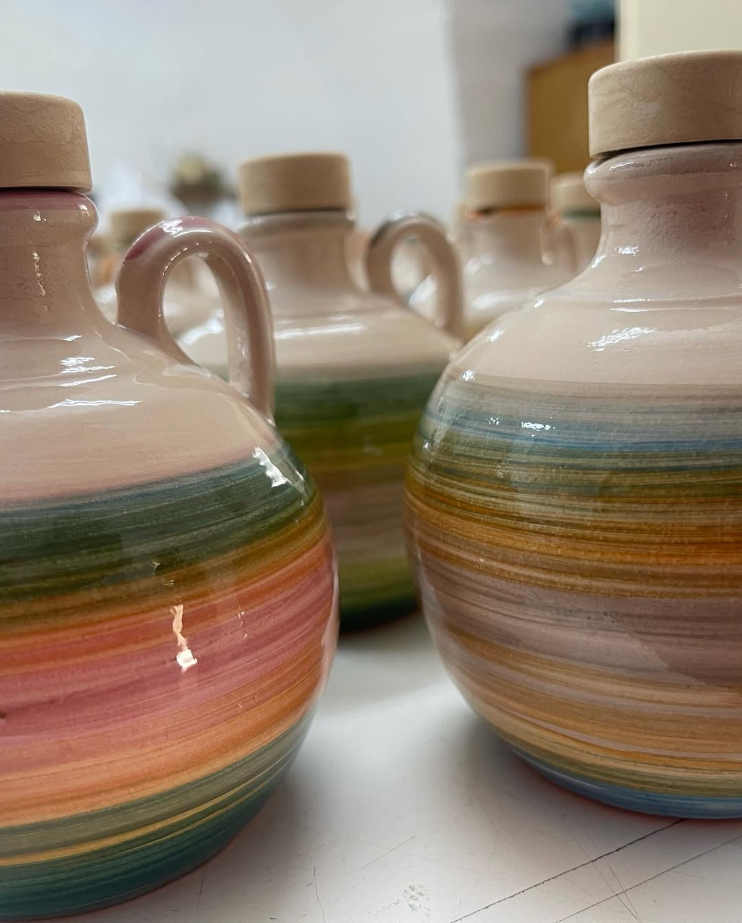 Un’oliera in ceramica artigianale è un oggetto elegante e funzionale, pensato per conservare e servire l’olio con stile. Realizzata interamente a mano, presenta una superficie liscia e leggermente lucida, rifinita con smalti che ne esaltano i dettagli. Può essere decorata con motivi tradizionali, come disegni floreali, geometrici o temi mediterranei, oppure lasciata monocromatica per un look più moderno e minimale.